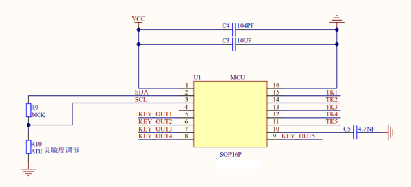 Output :5 个输出口(KEY OUT1,KEY OUT2, KEY OUT3, KEY OUT4,KEY OUT5) Input:5 个触摸按键(TK1,TK2,TK3,TK4,TK5)